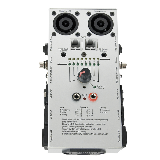 Veelzijdige kabelcontrole: Test kabels met verschillende connectoren, zoals Speakon 4P, Speakon 8P, RJ45, RCA, XLR 3P, XLR 5P, 5P Din, 6,3 mm Jack, en 3,5 mm Jack.